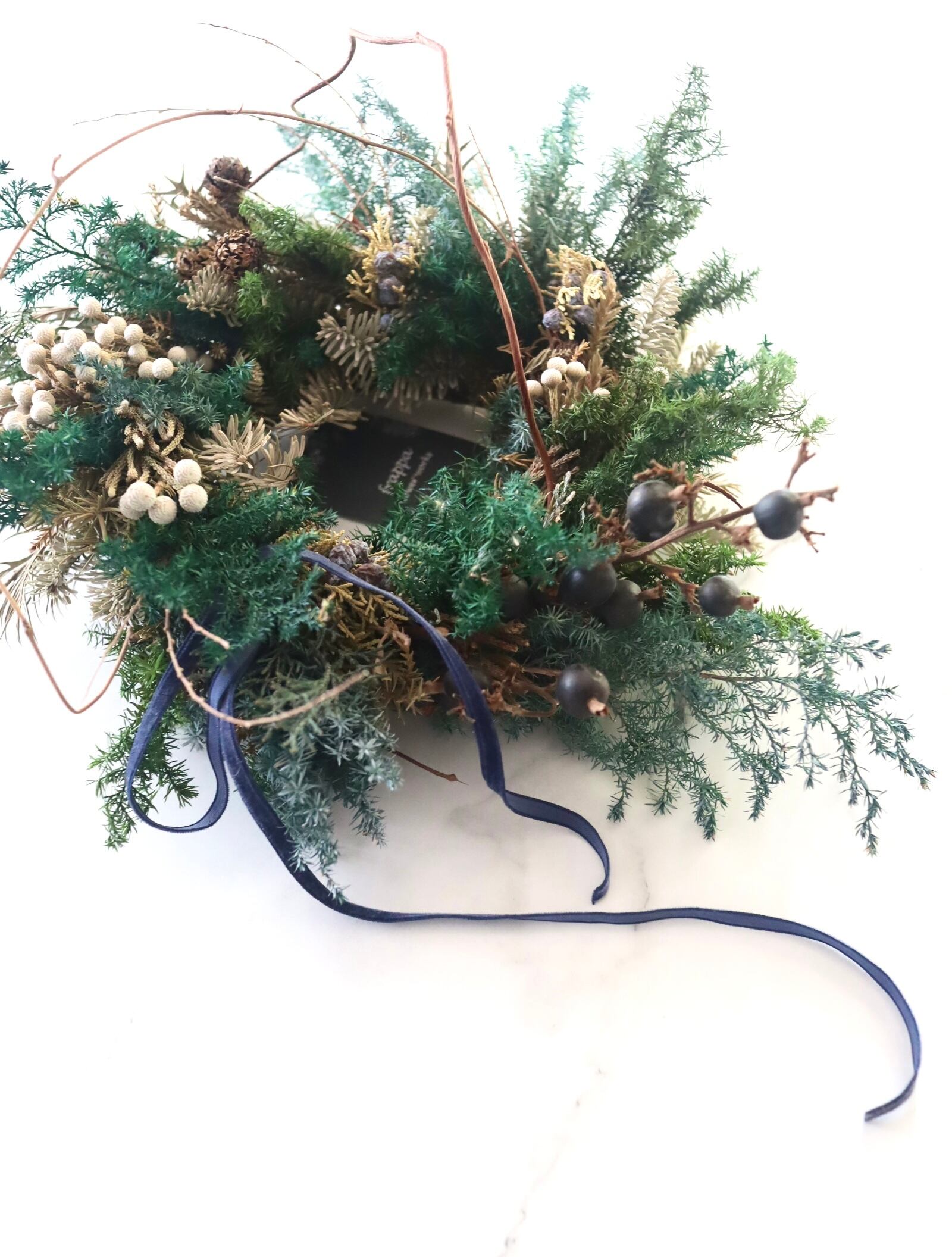 細めのベロアリボンはネイビーです。