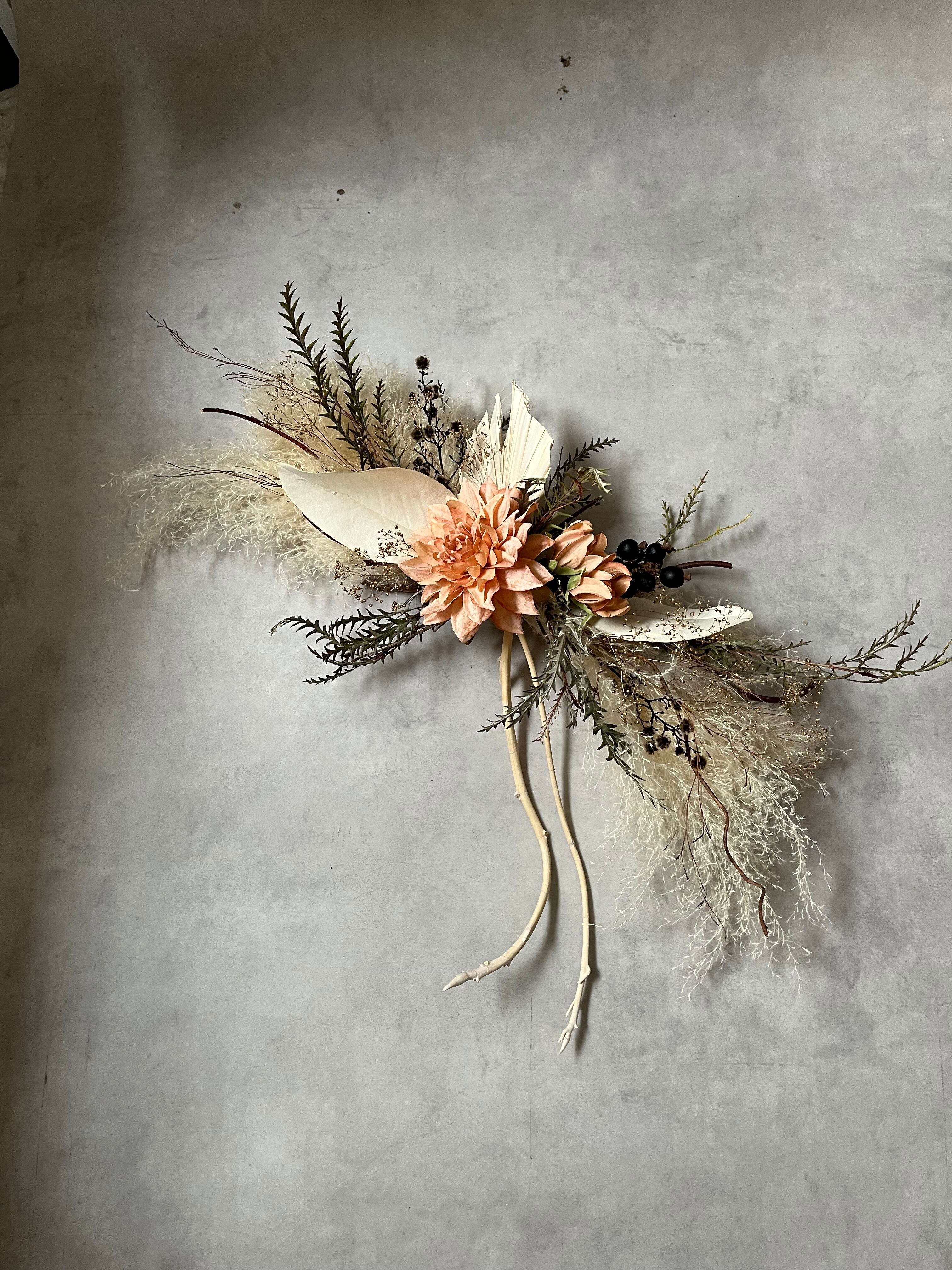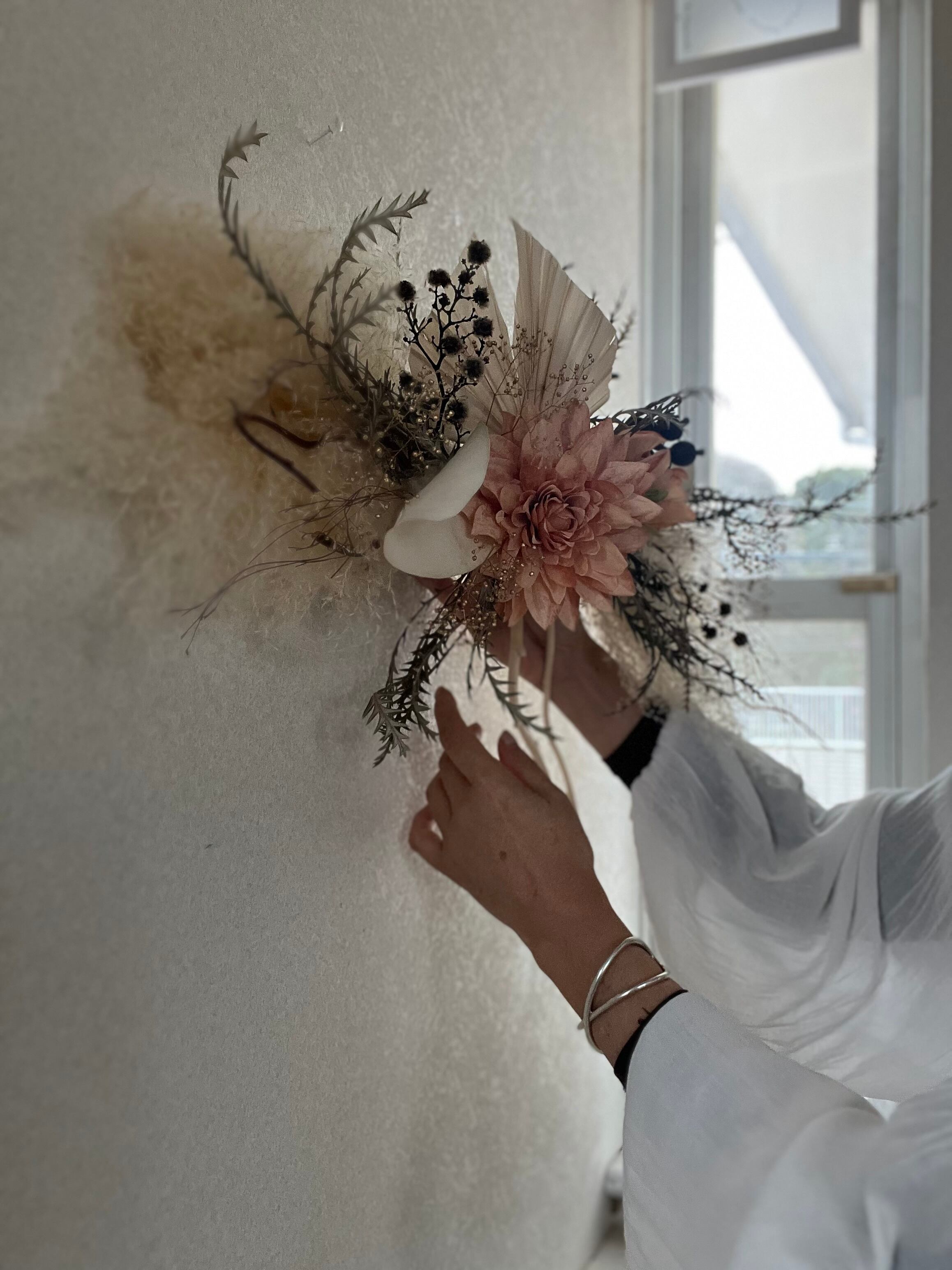ドライフラワーのウォールデコレーションは、お部屋や店舗をおしゃれに演出するのに最適です。ナチュラルで温かみのある雰囲気を作り出します。写真撮影用のフォトブースやウェルカムスペース、開店祝いやバースデーフォトにもぴったりのアイテムです。